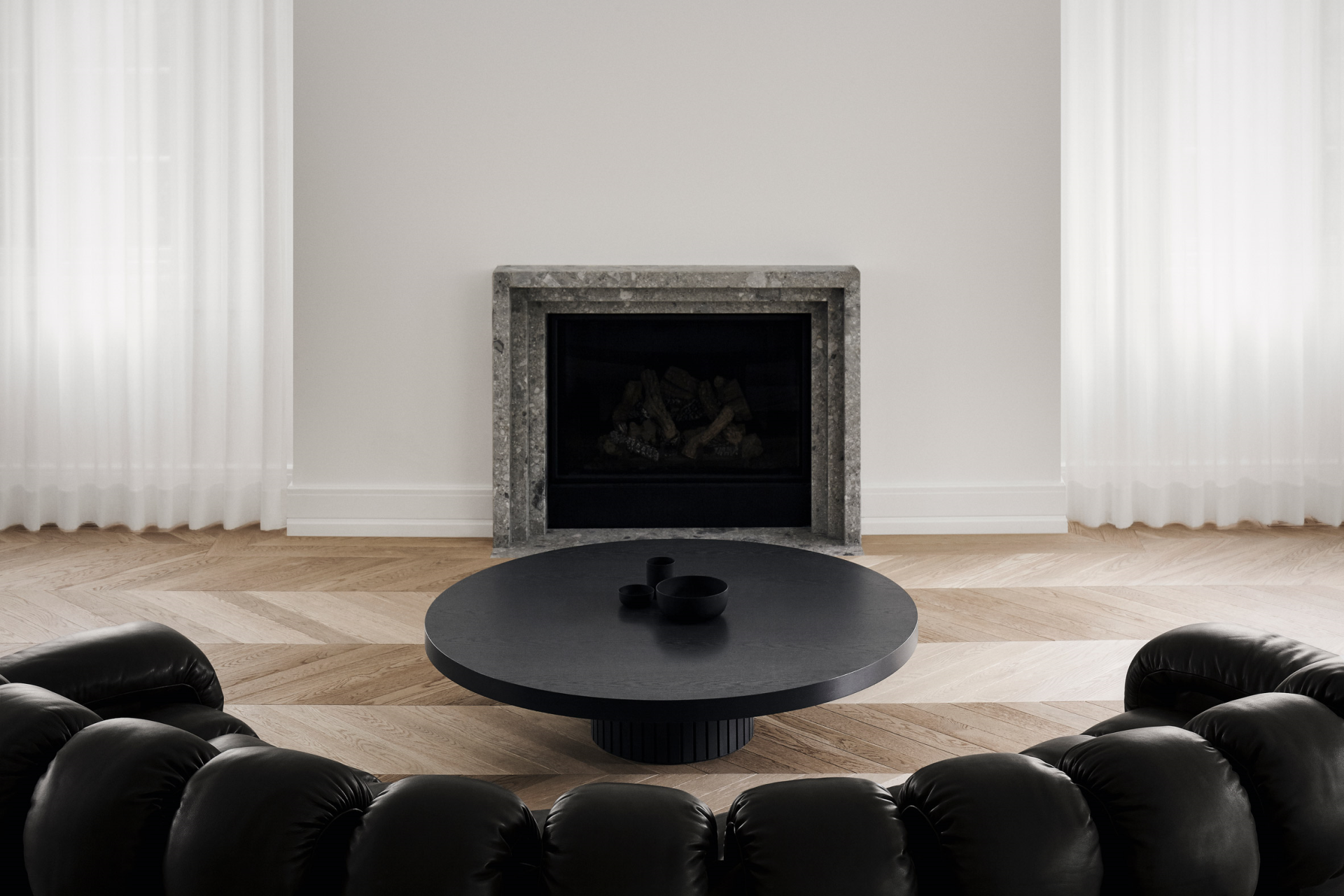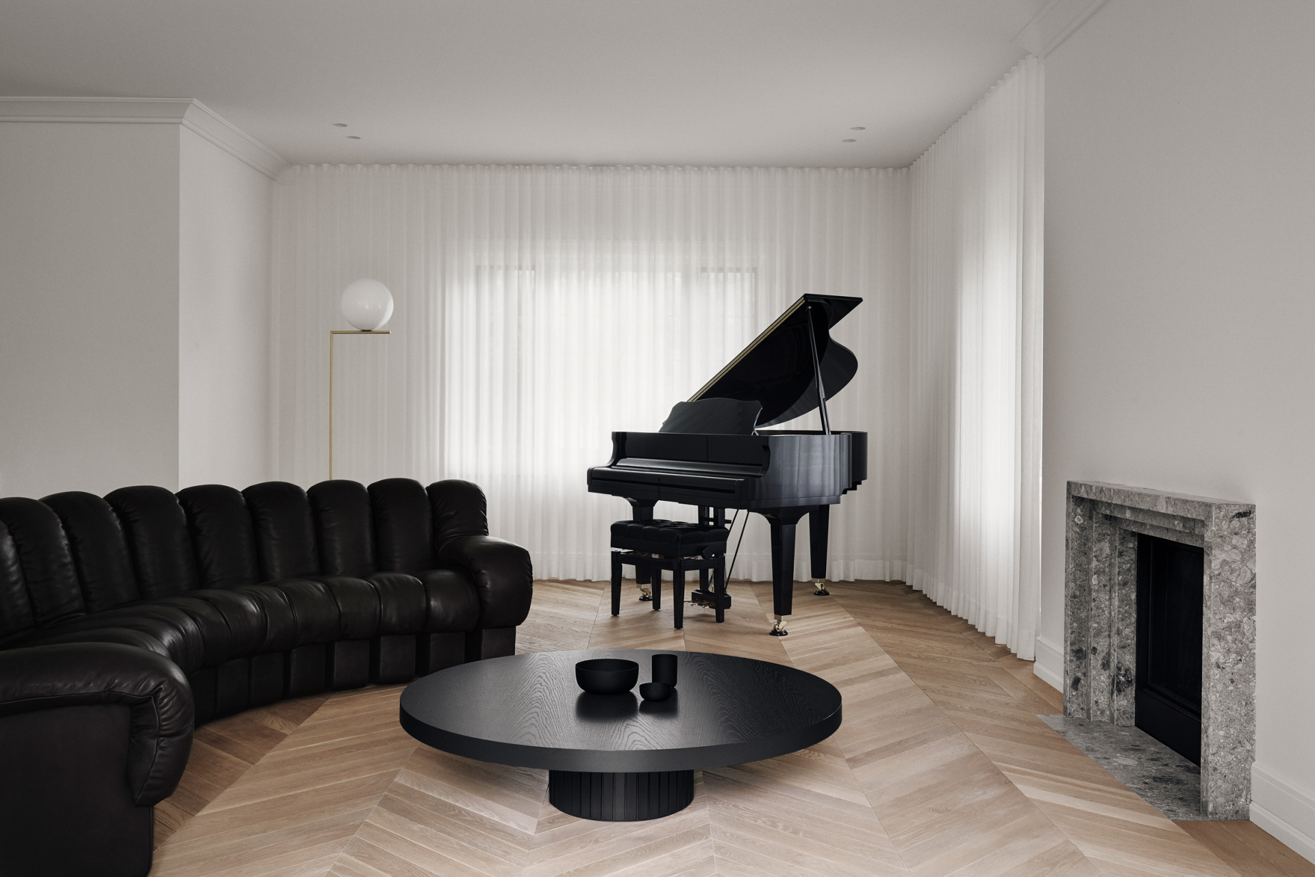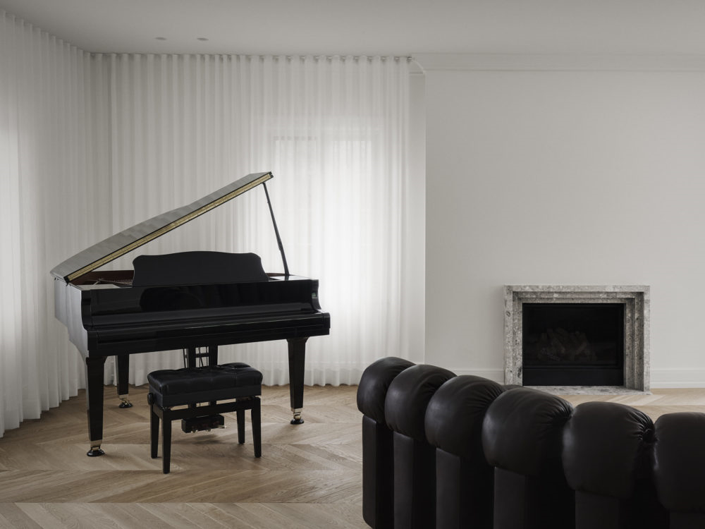 與 de Sede 的圓形毛絨沙發(fā)和三角鋼琴形成色調(diào)和材質(zhì)的雙重對(duì)比