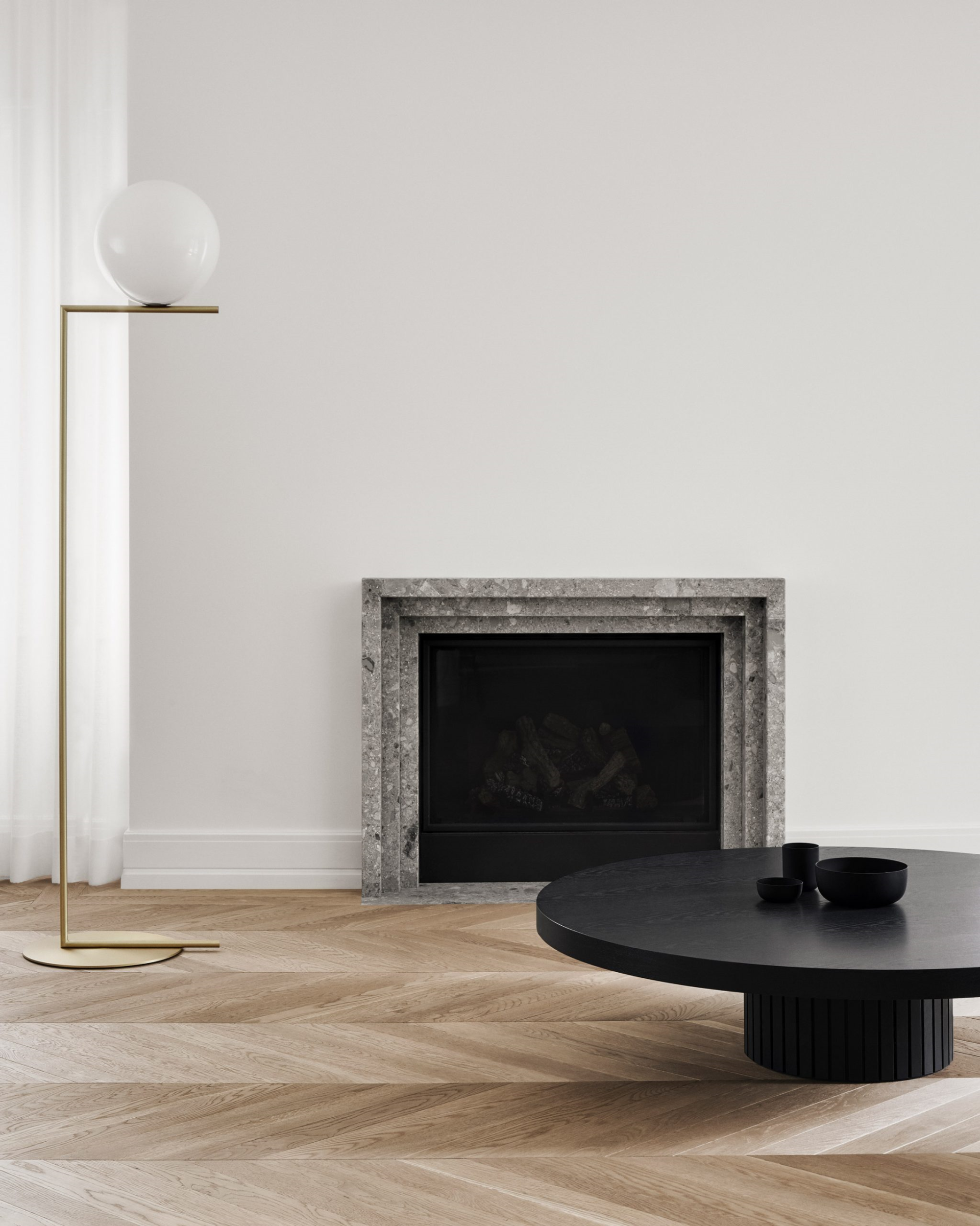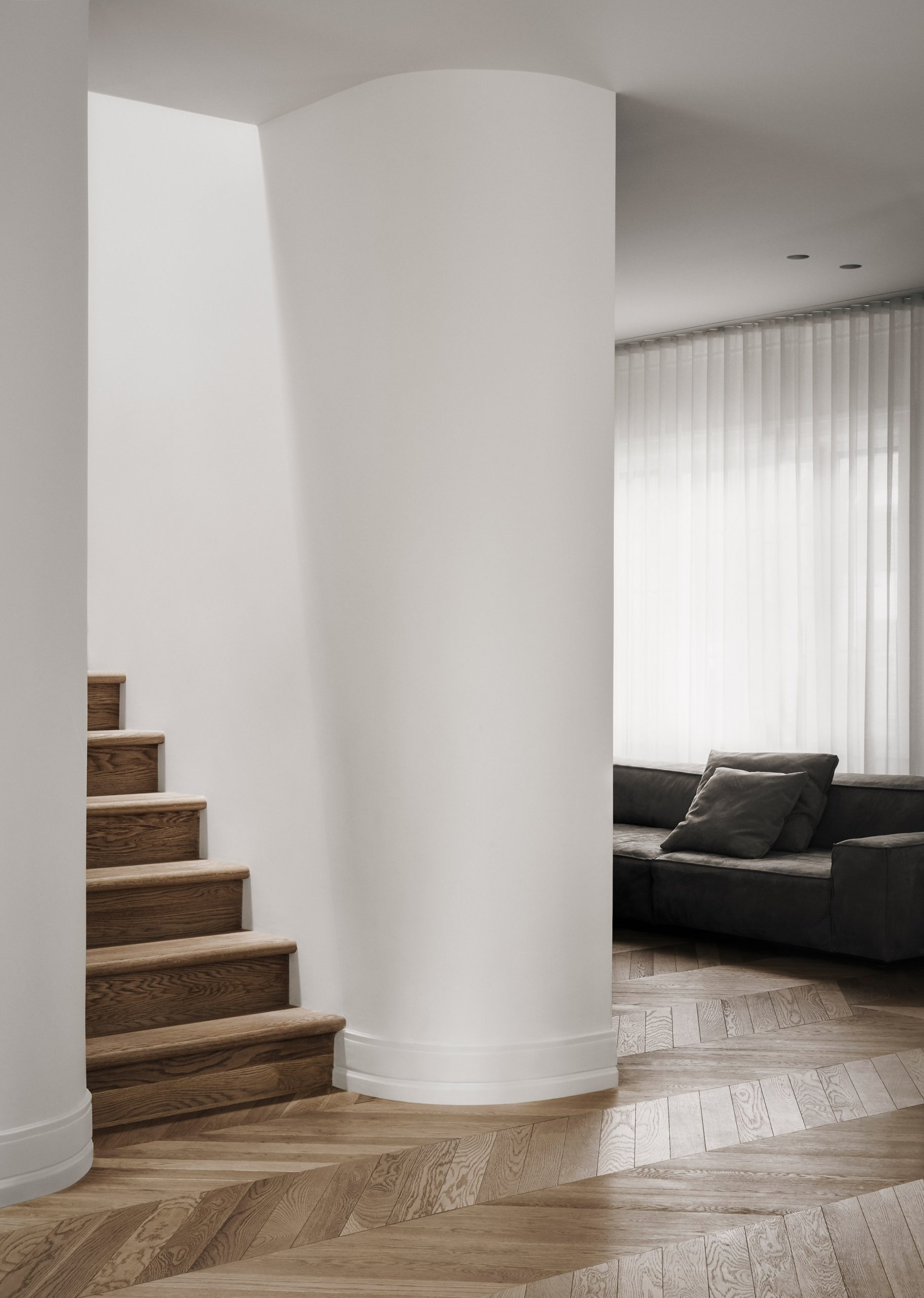 改造后保留了弧形墻壁和其他一些古典的建筑細(xì)節(jié)位于轉(zhuǎn)角處的影音室擺放灰色模塊沙發(fā),搭配經(jīng)典 FLOS落地?zé)簦瑩]灑現(xiàn)代簡(jiǎn)約氣質(zhì)